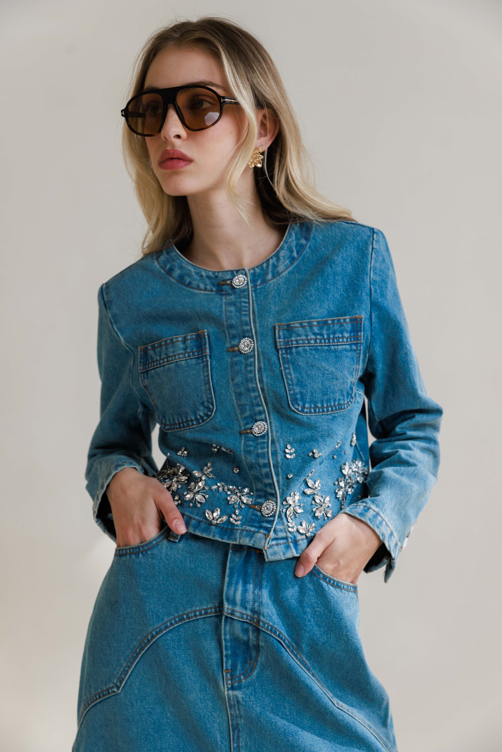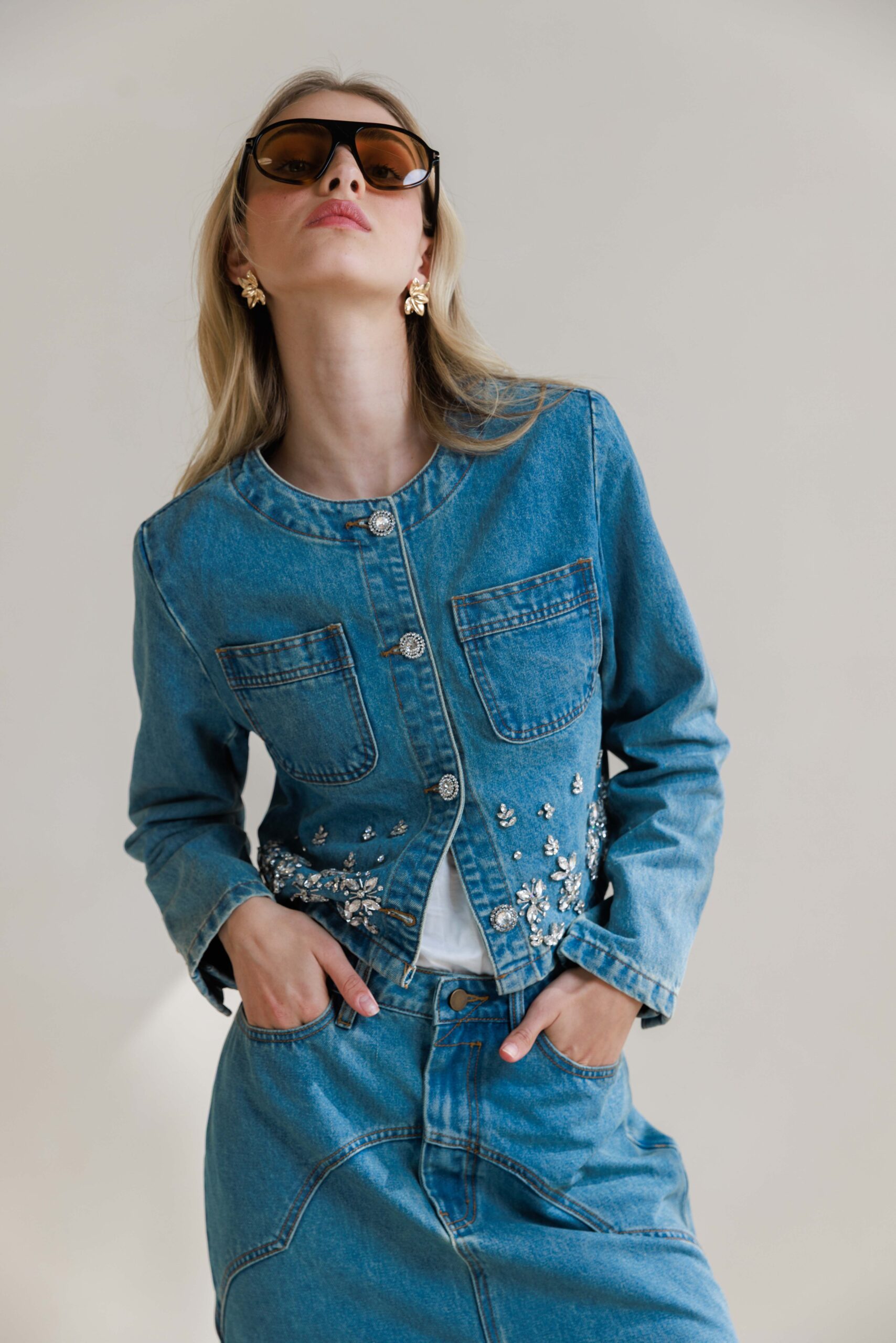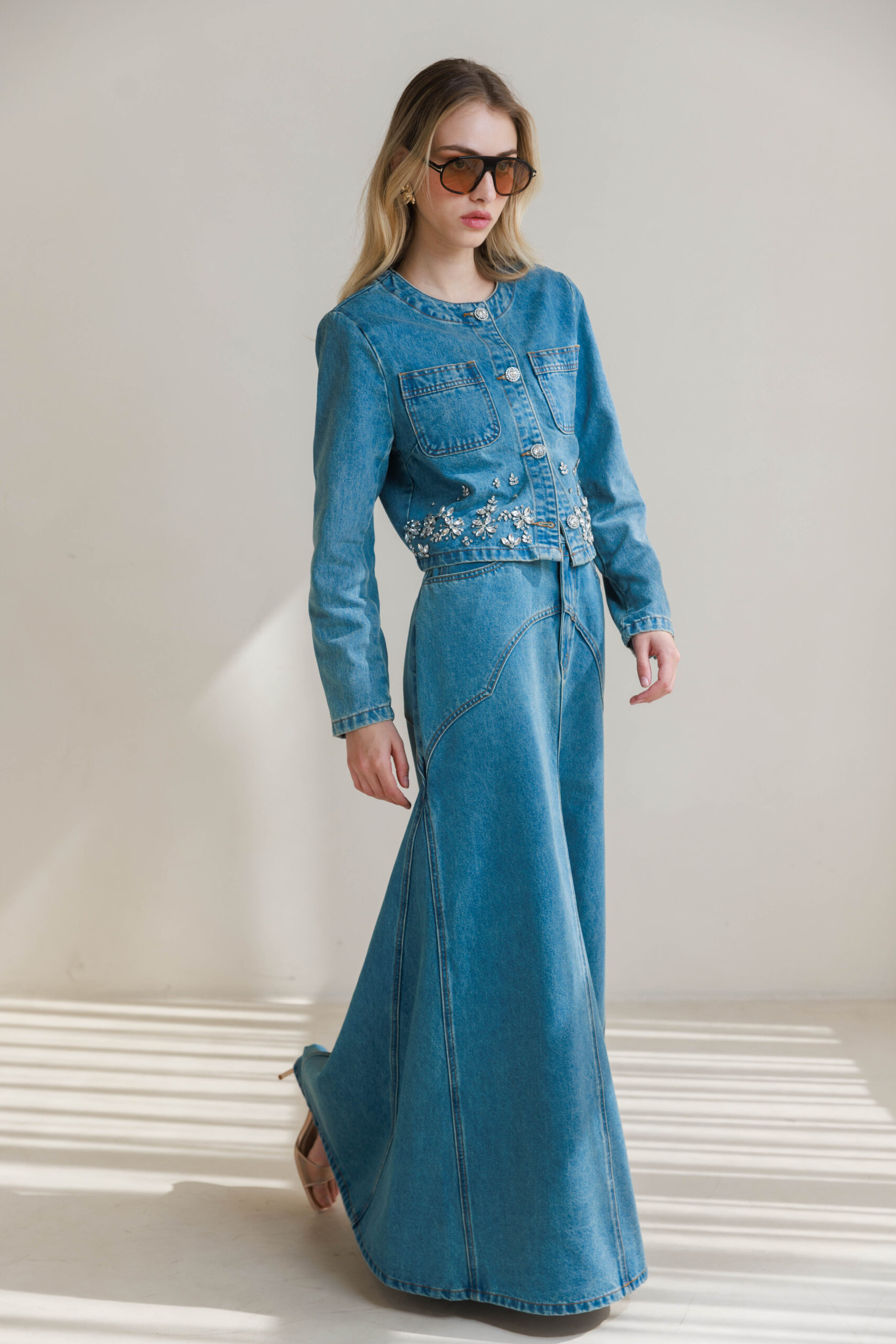 בד קליל בגוון כחול בהיר, עיטורי רקמה עדינה,
