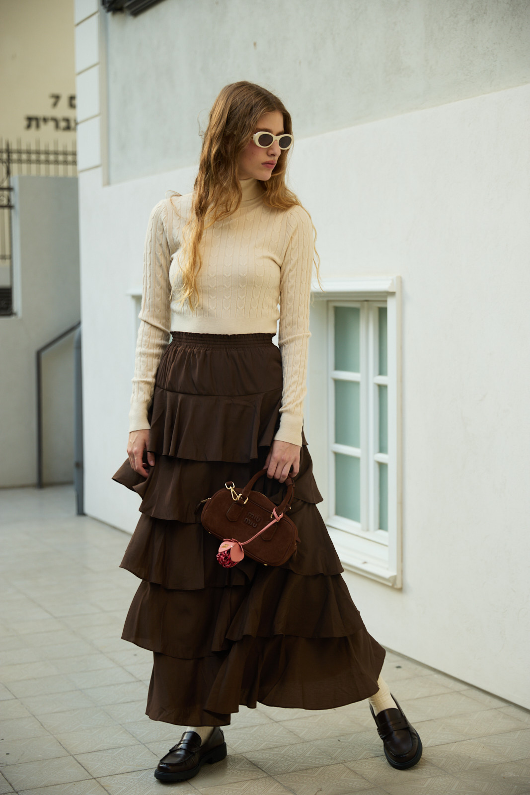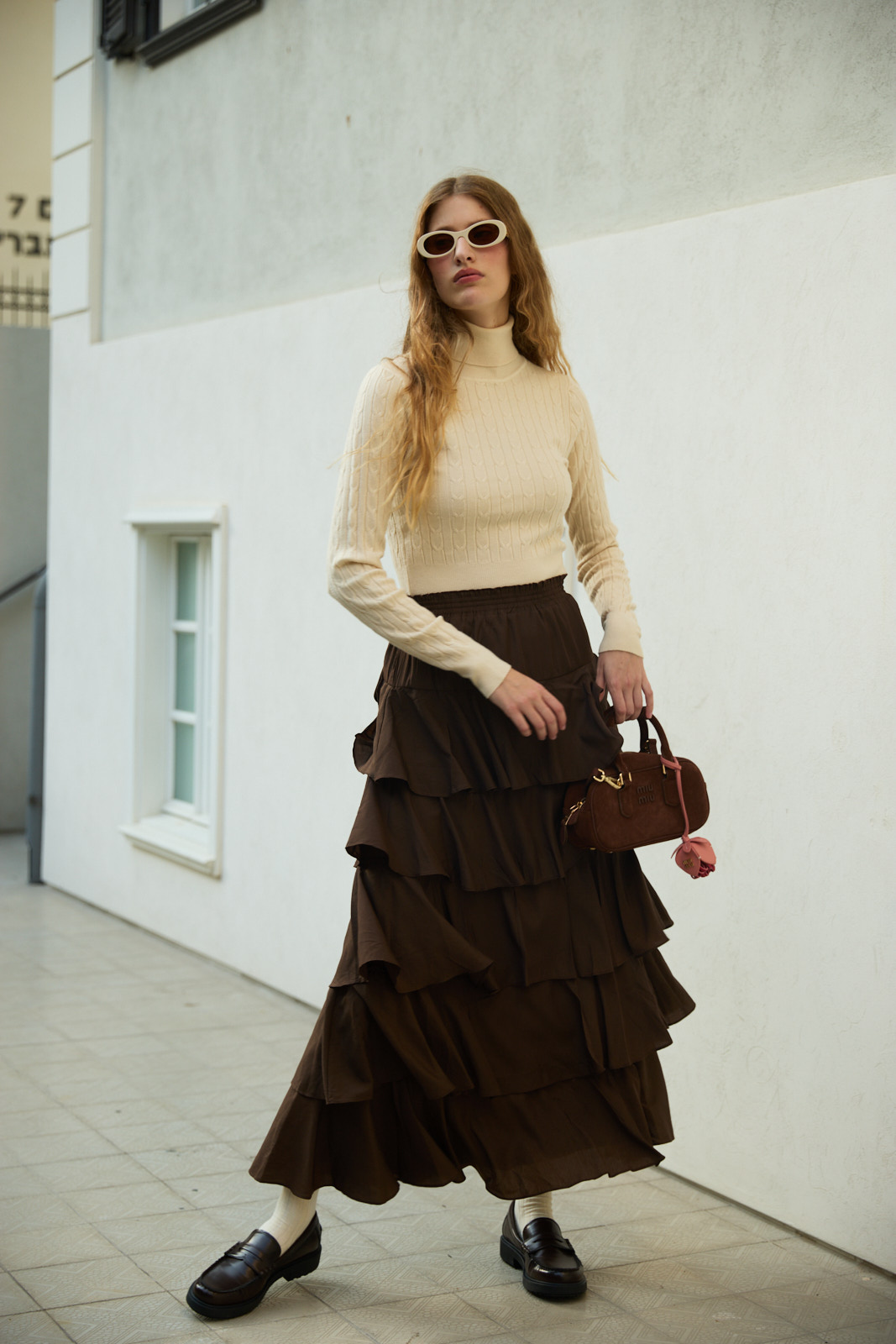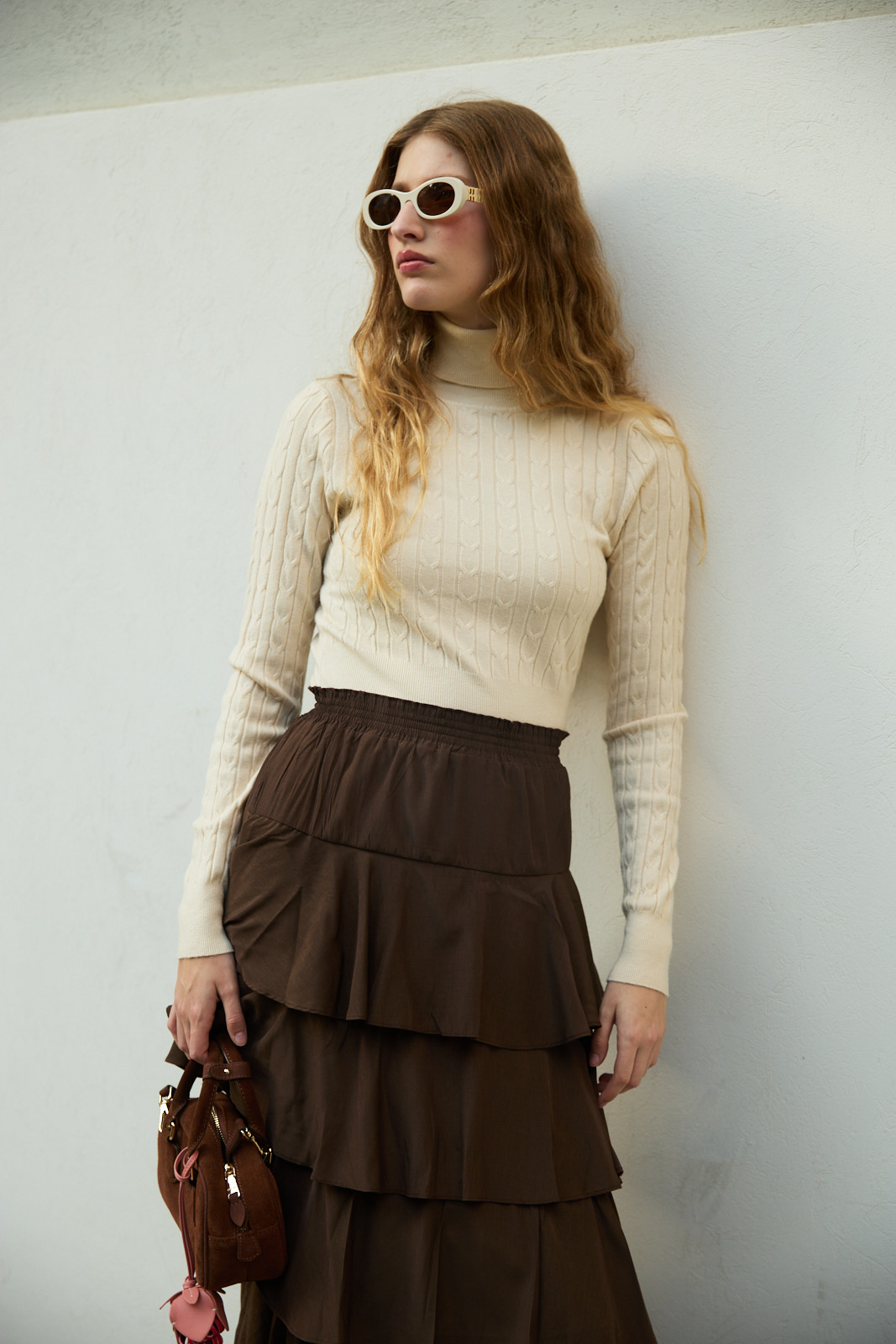 הגולף הגבוה מעניק מראה קלאסי והסריגה העשירה יוצרת לוק חורפי עם נוכחות.