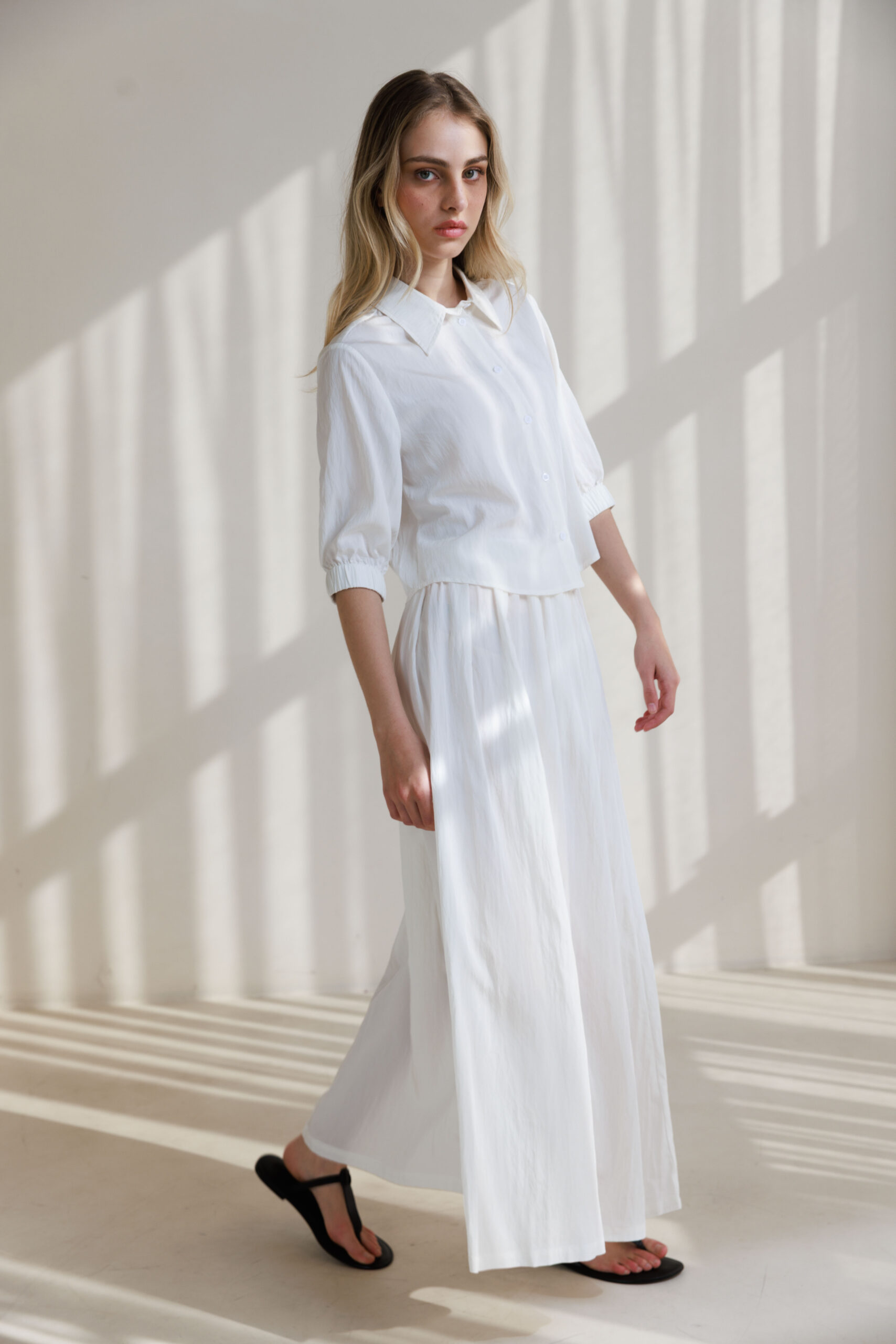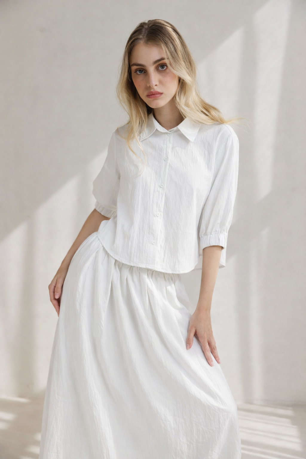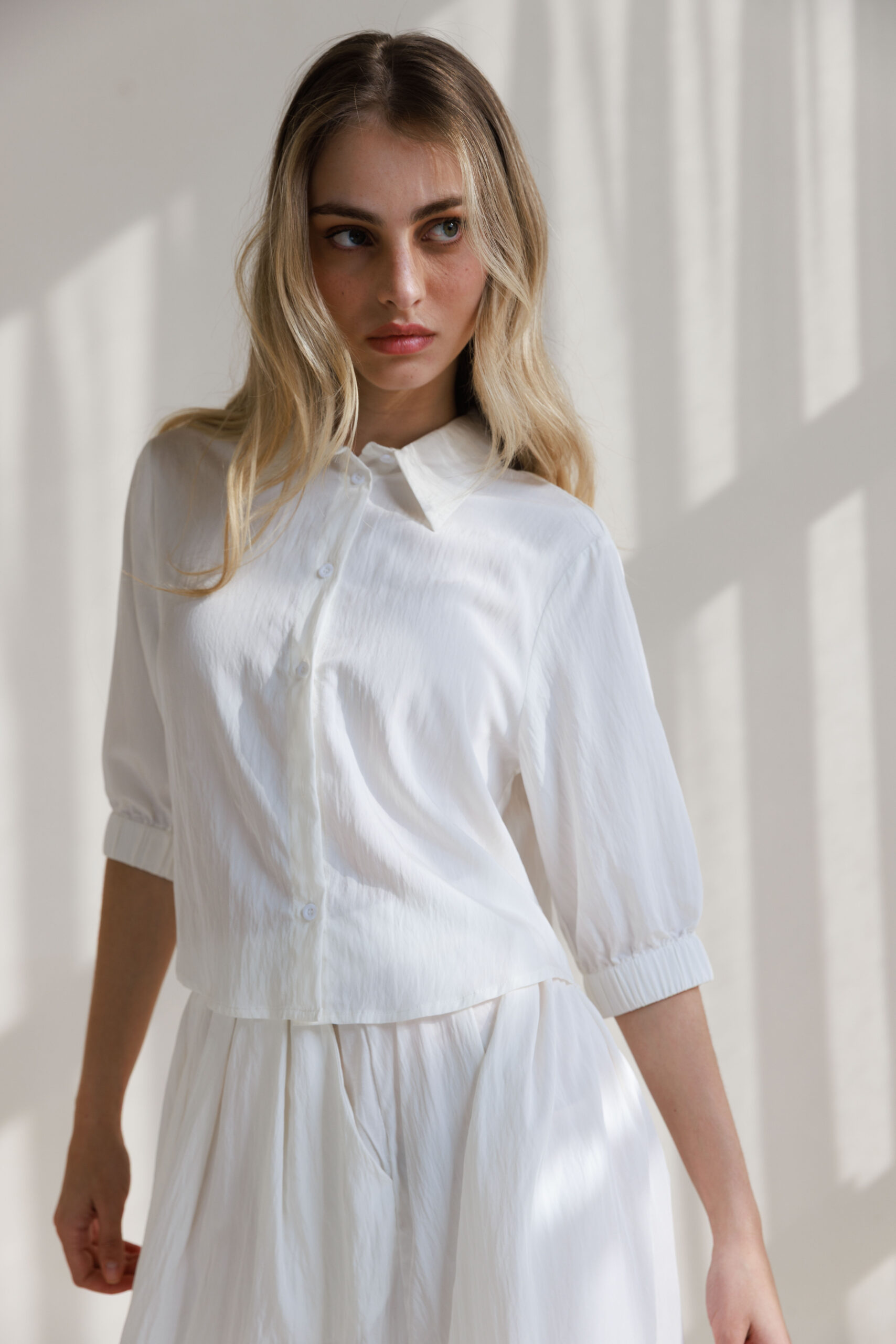 חולצה מבד קליל עם שרוולים תפוחים וסיומת גומי עדינה.