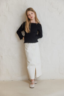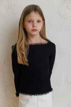 גזרה צמודה עם פתח צוואר מרובע מעוטר בתחרה עדינה.