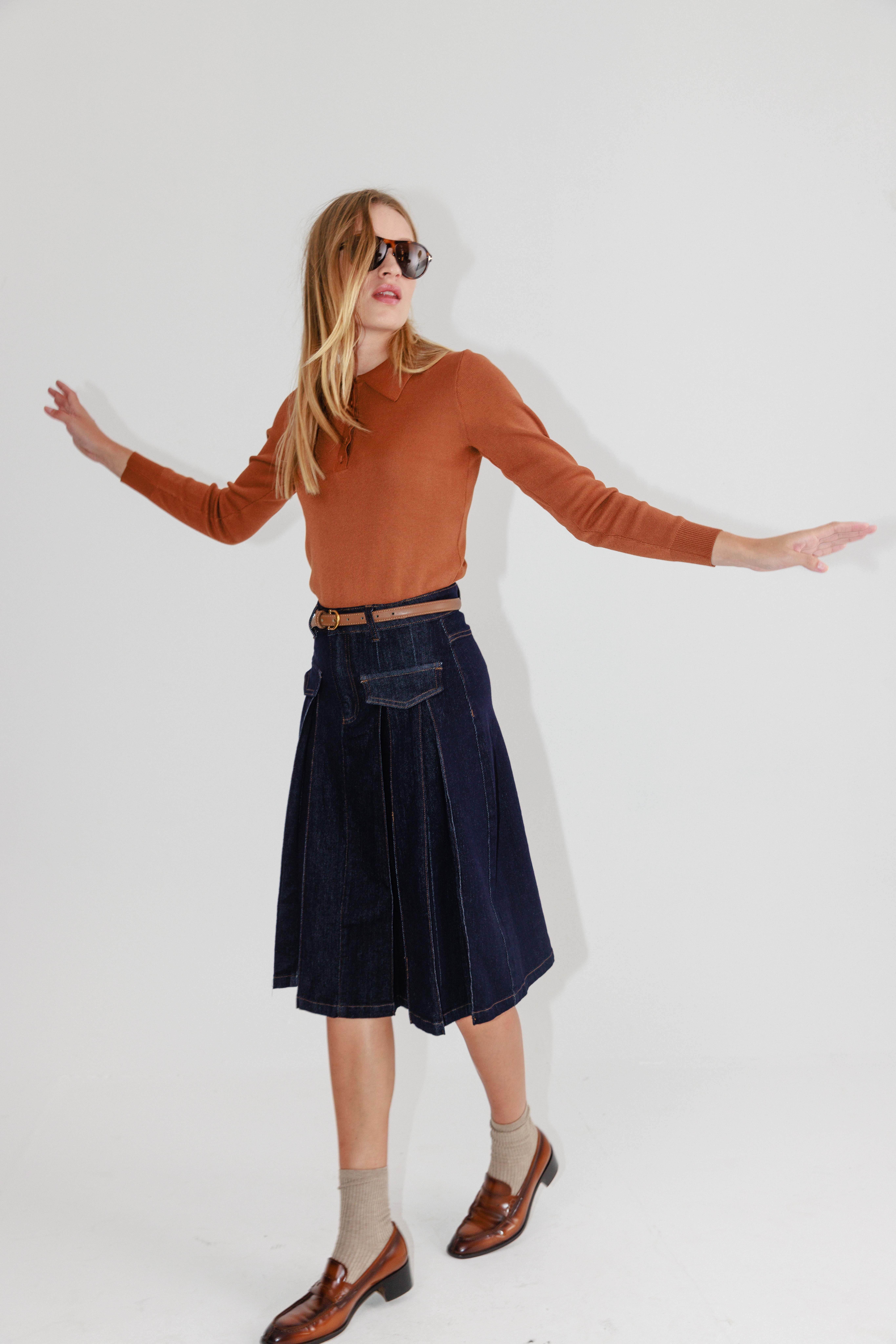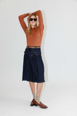 חצאית ג׳ינס בגזרת A קפלים – קלאסית, מחמיאה ונכונה לכל לוק.