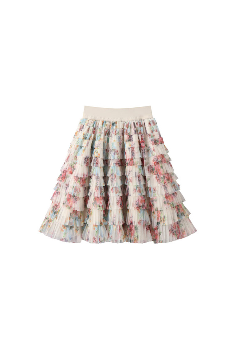 החצאית בנויה משכבות טול רכות בשילוב הדפס פרחוני, בגזרה מתרחבת.
