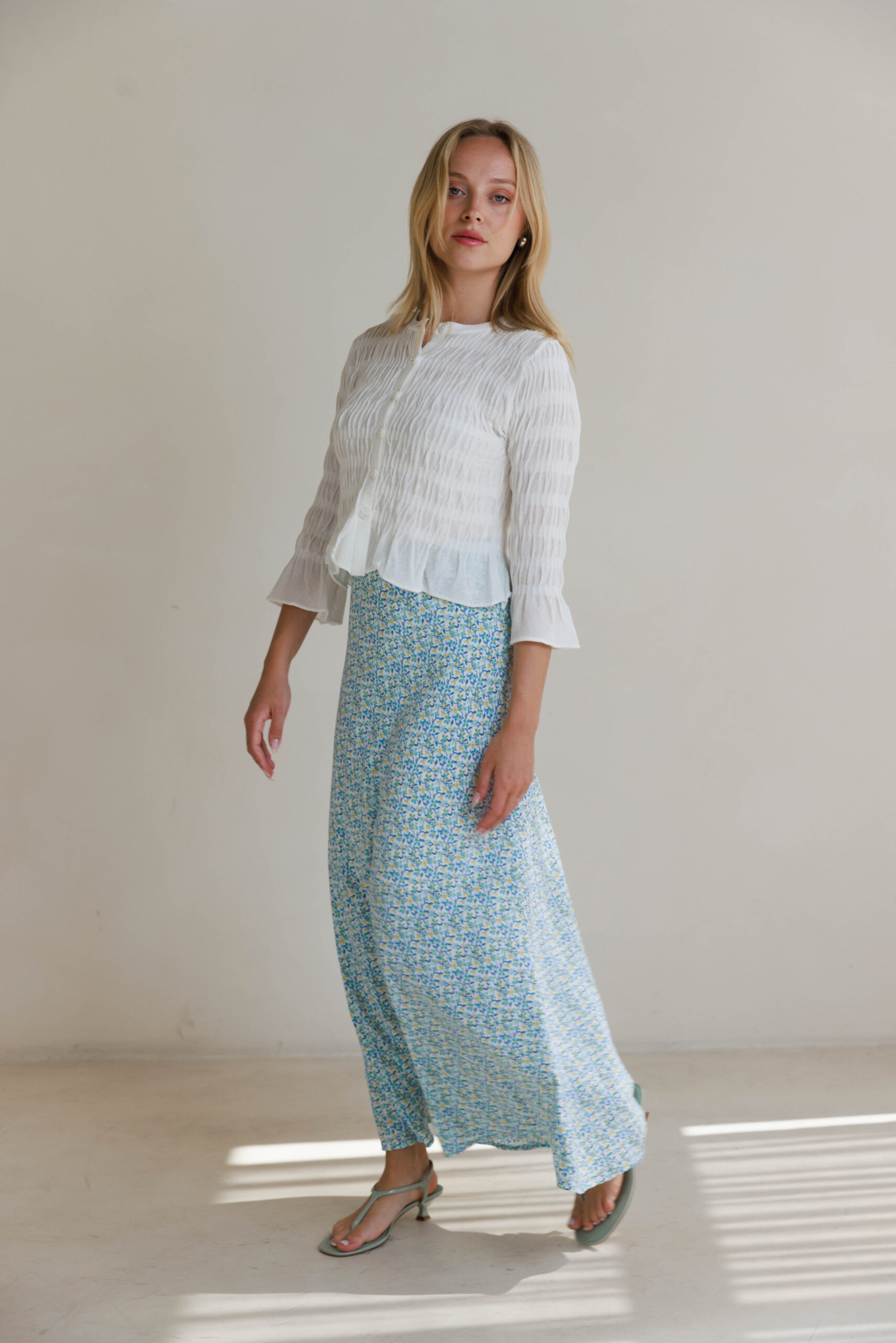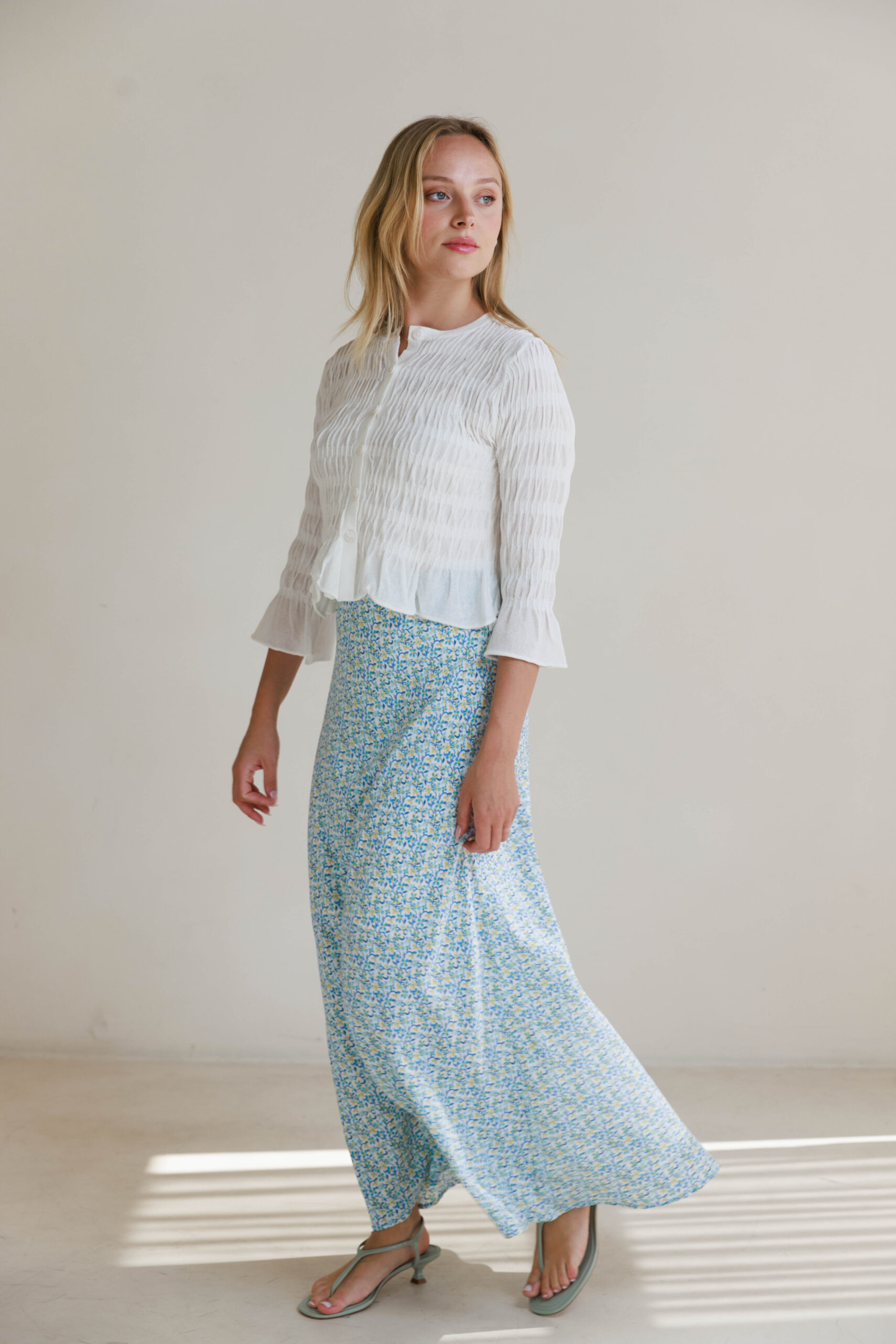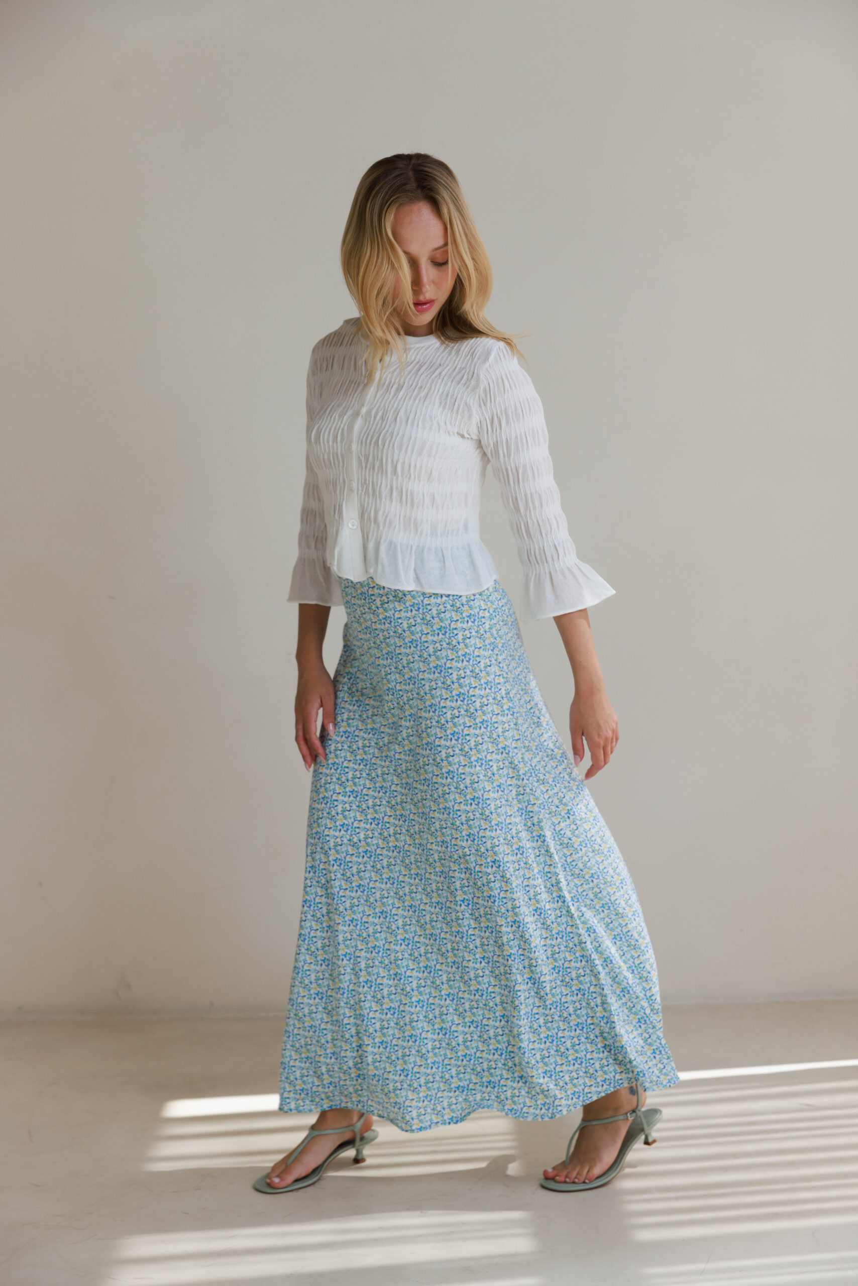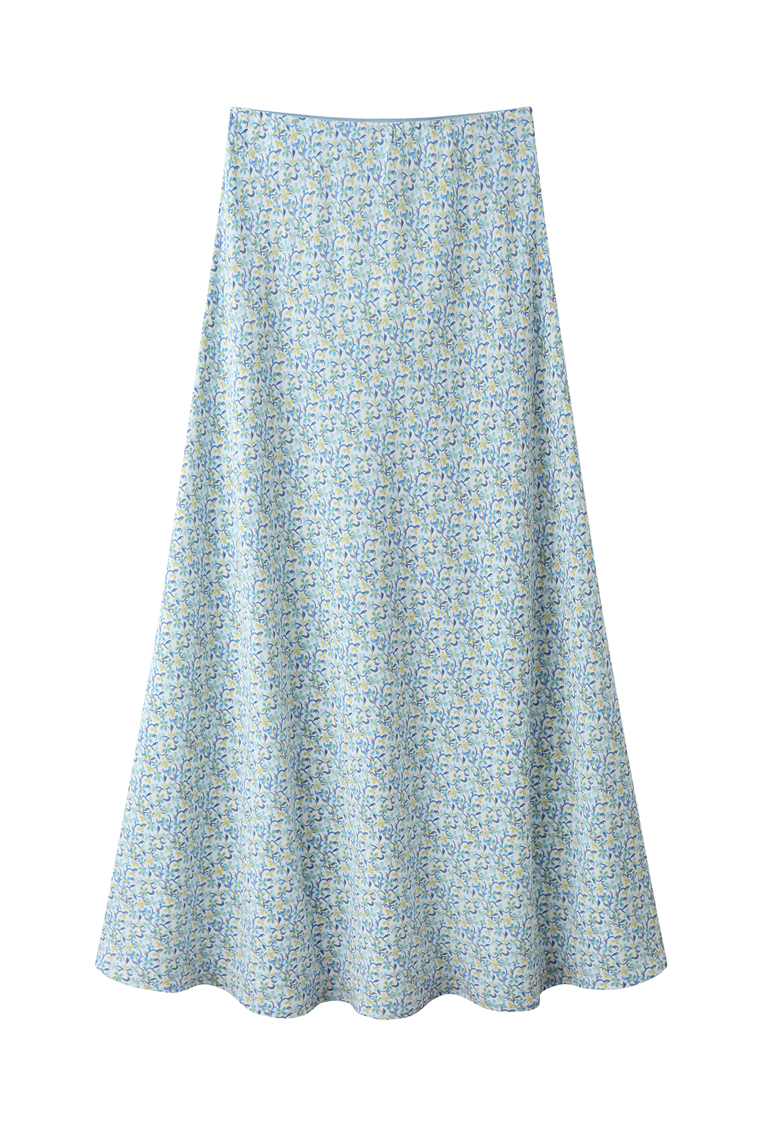 חצאית סאטן תכלת פרחוני
