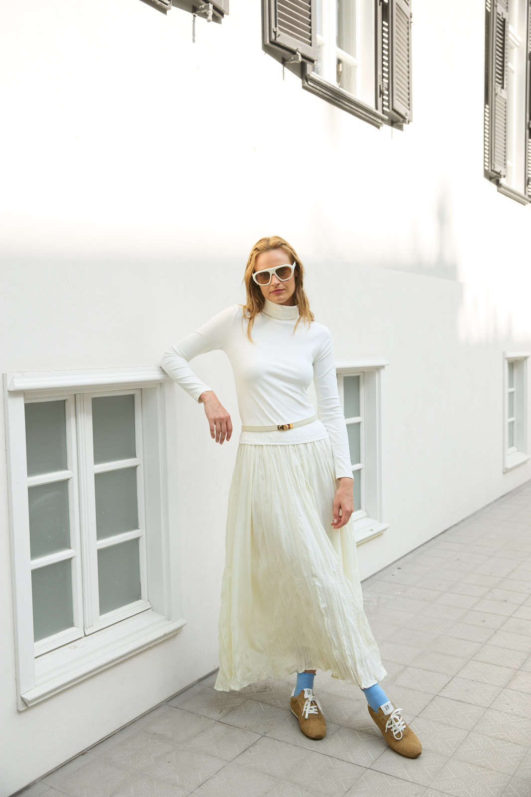 החצאית מושלמת לשילוב עם חולצות חלקו, סריג CB תואם או חולצות אלגנטיות,