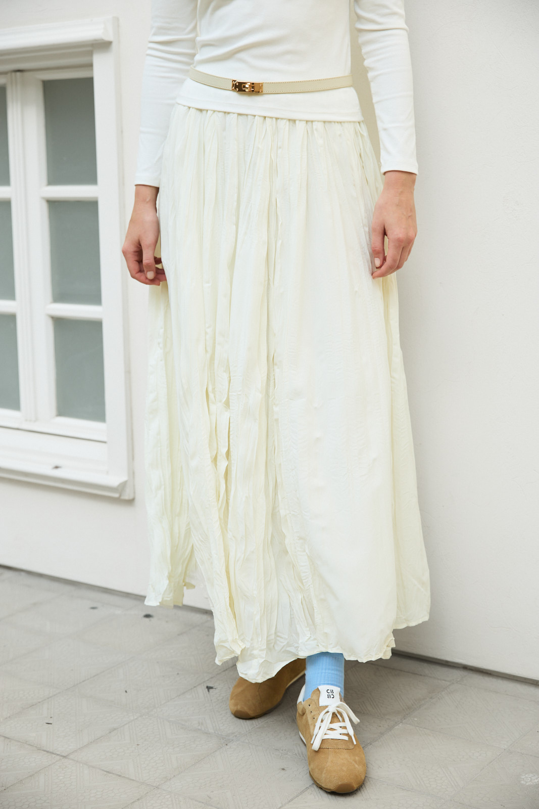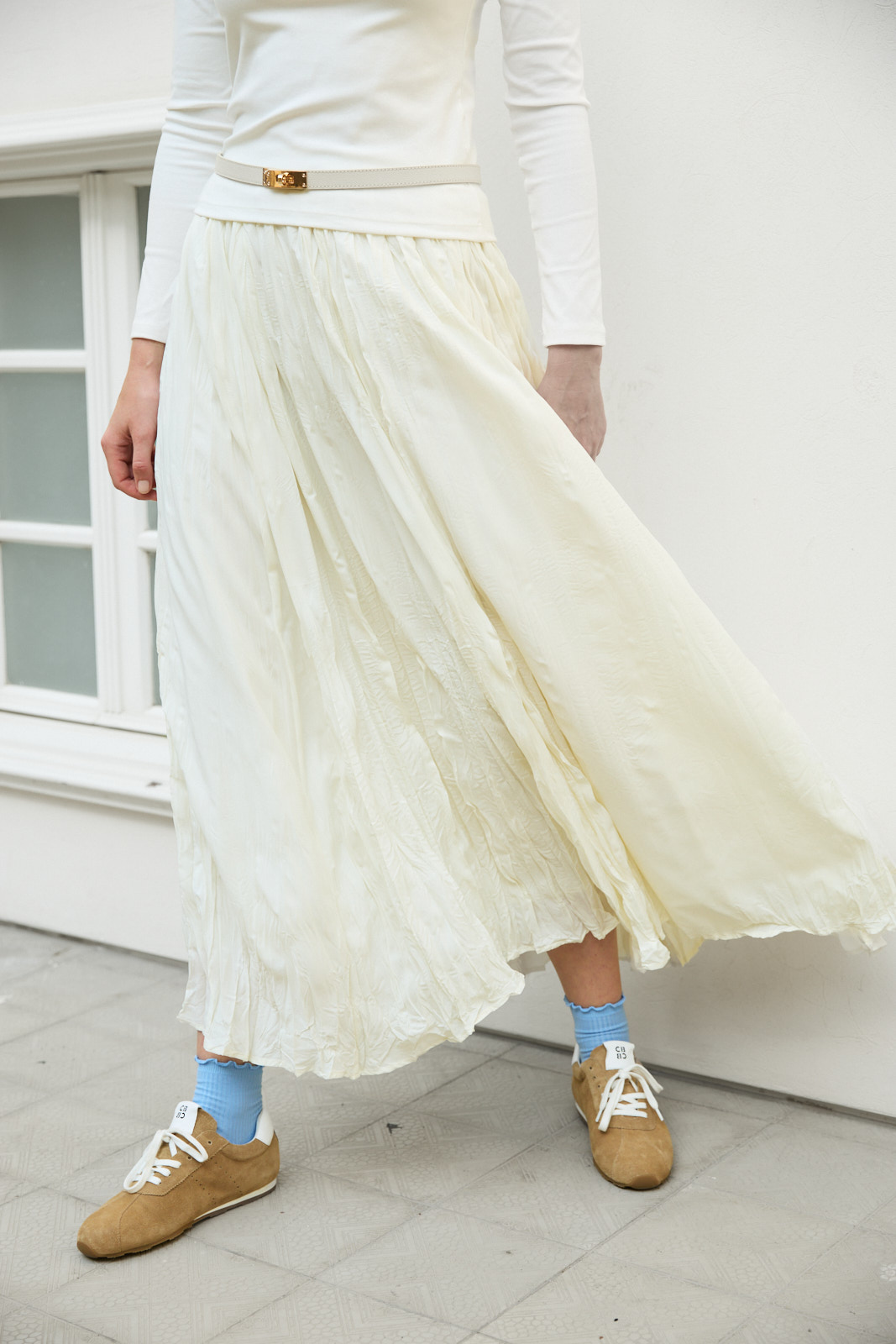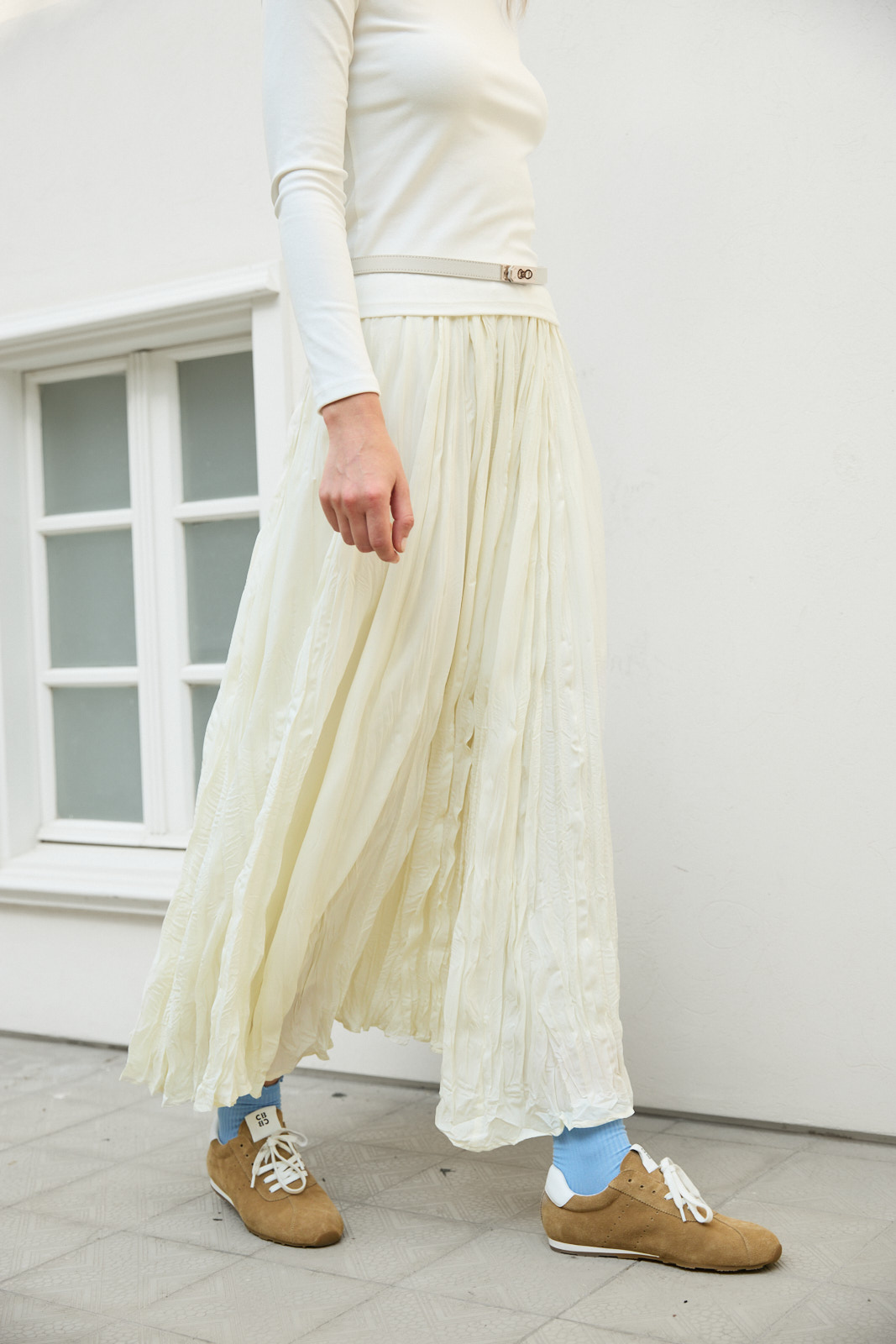 הבד המקומט מעניק טקסטורה עשירה המשלימה את הקו אופנתי של החצאית.