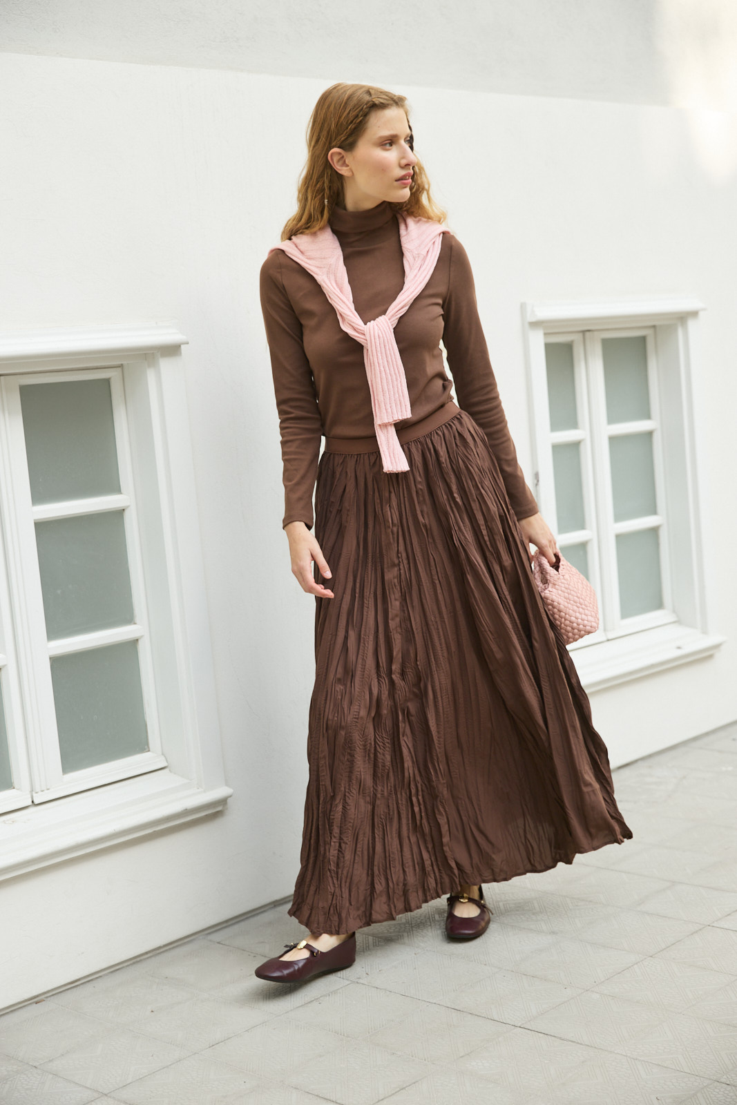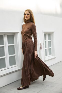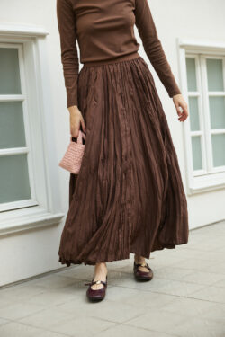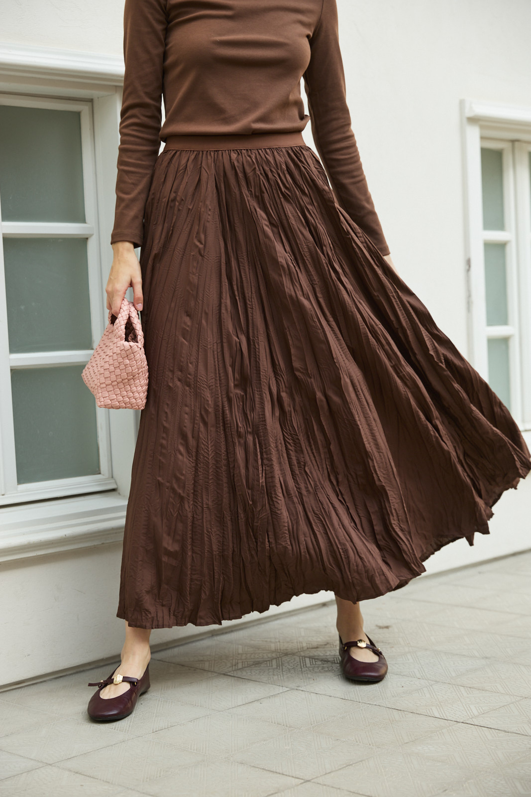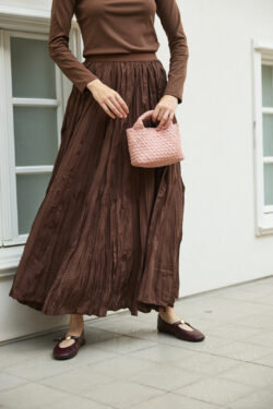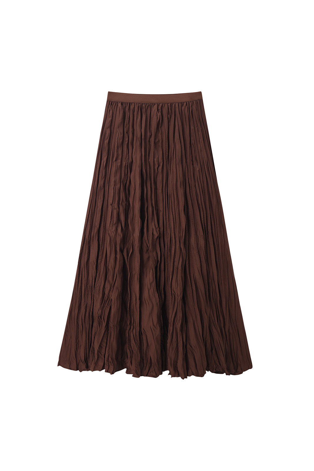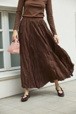 הבד המקומט מעניק טקסטורה עשירה המשלימה את הקו אופנתי של החצאית.