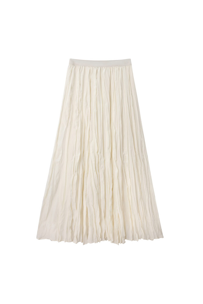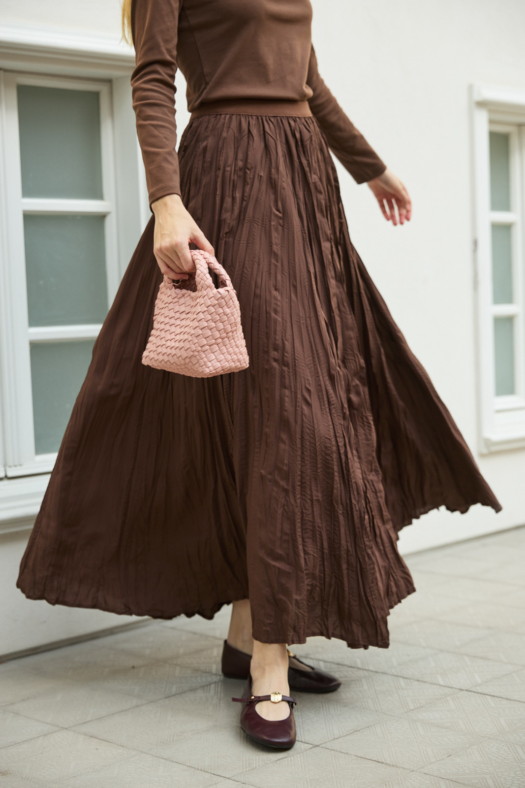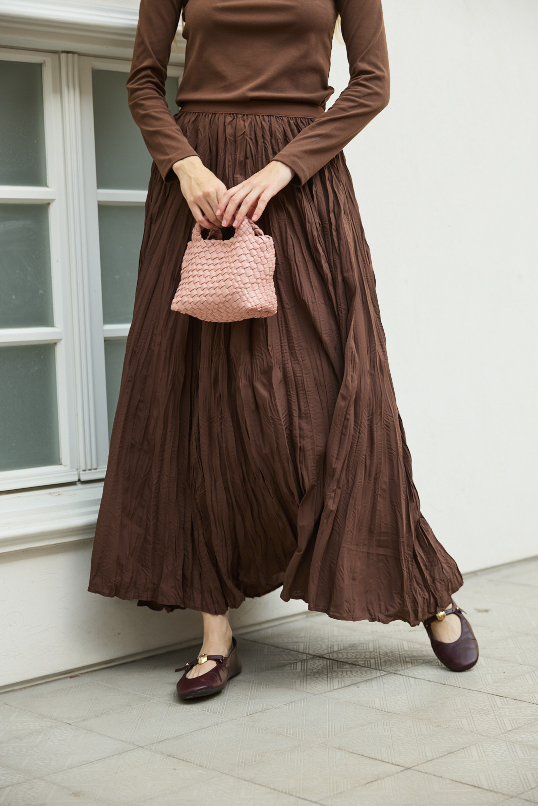הבד המקומט מעניק טקסטורה עשירה המשלימה את הקו אופנתי של החצאית.