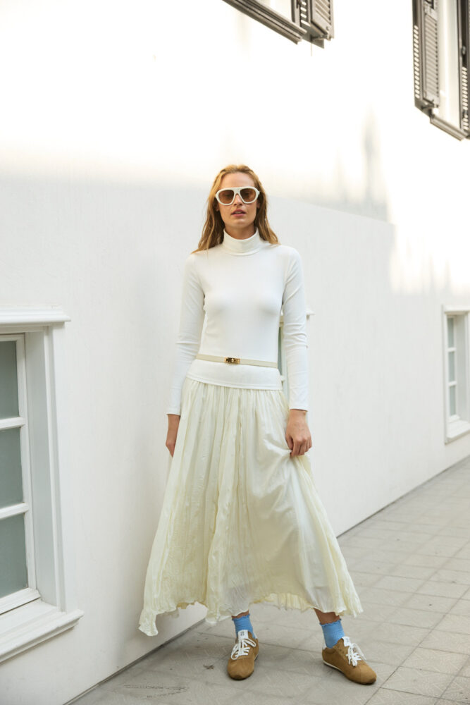 החצאית מושלמת לשילוב עם חולצות חלקו, סריג CB תואם או חולצות אלגנטיות,