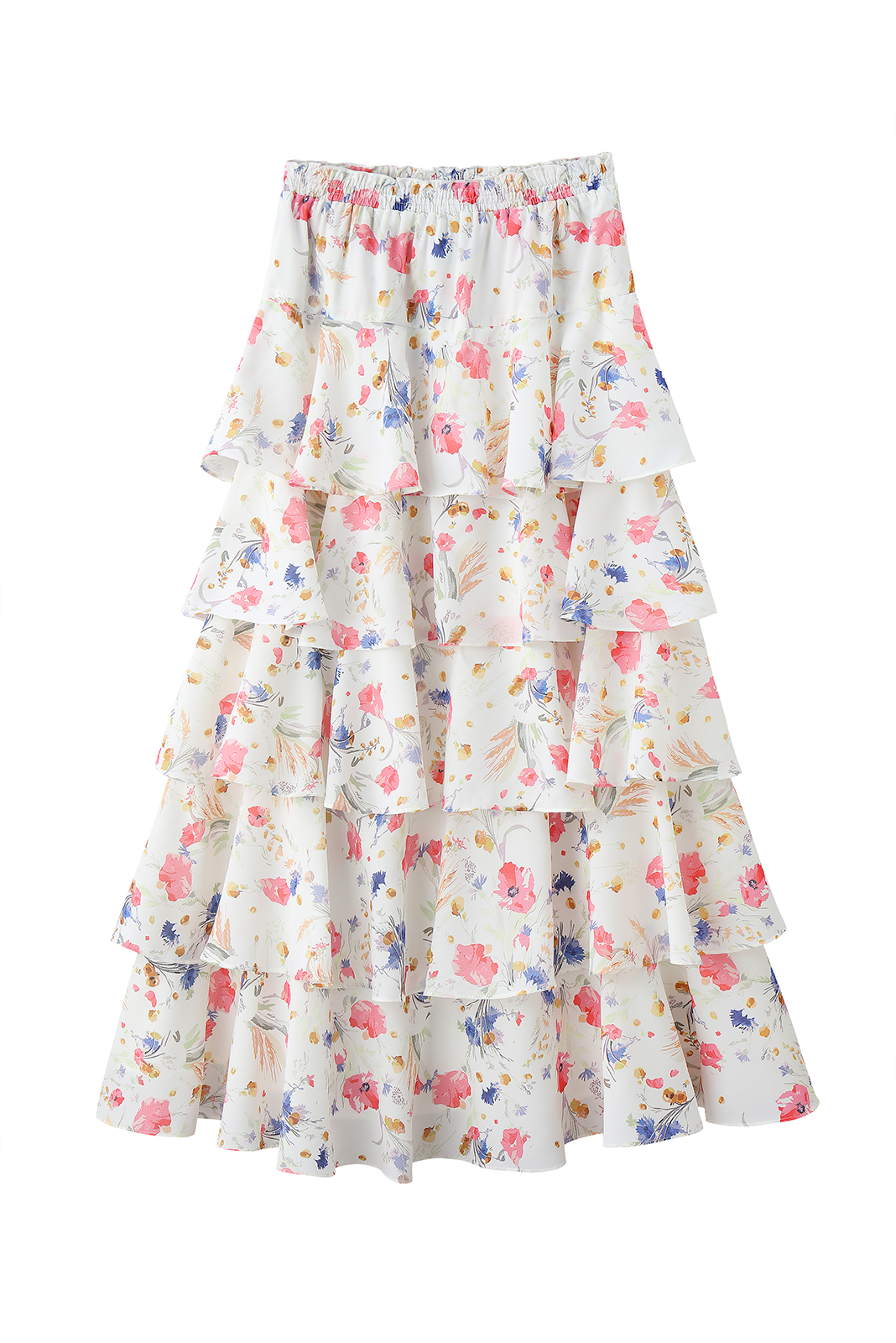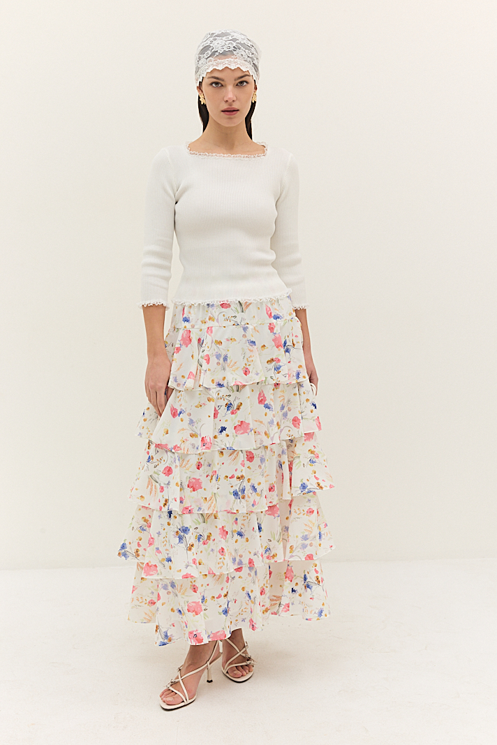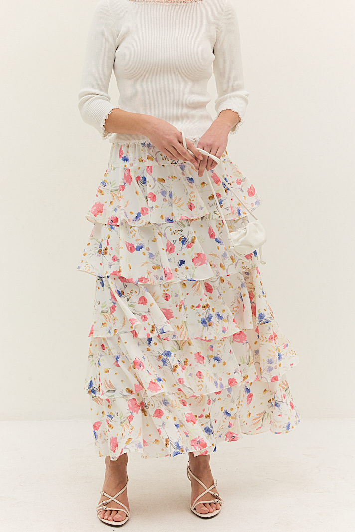 חצאית שכבות פרחונית בגזרת מקסי, מבד רך במרקם שיפון ,