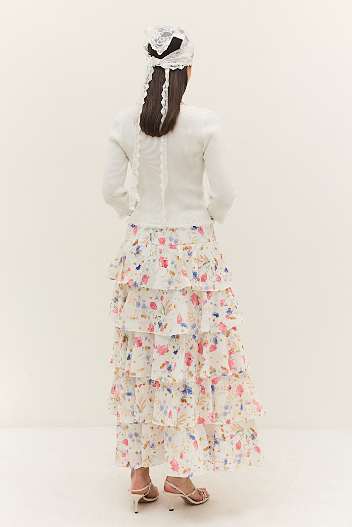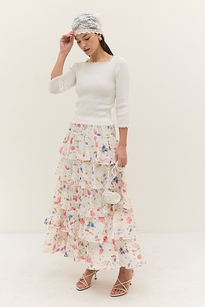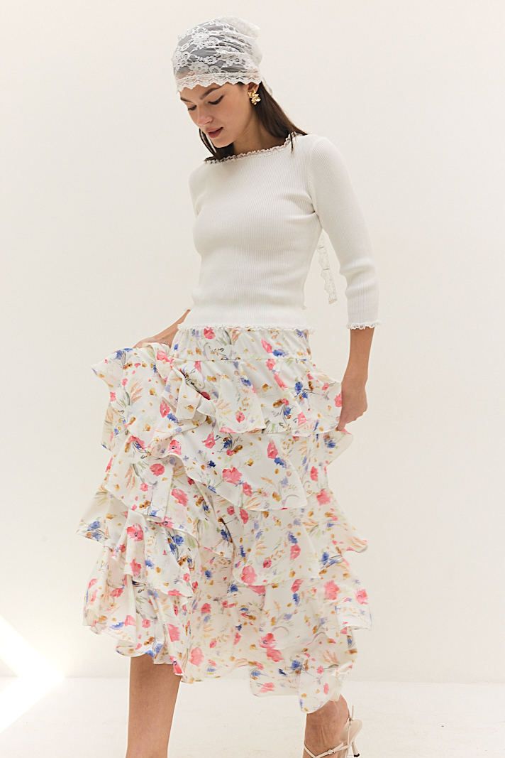 החצאית כוללת כמה שכבות קפלים המדורגות זו מעל זו, בד נעים למגע, ליצירת מראה אביבי ואוורירי,