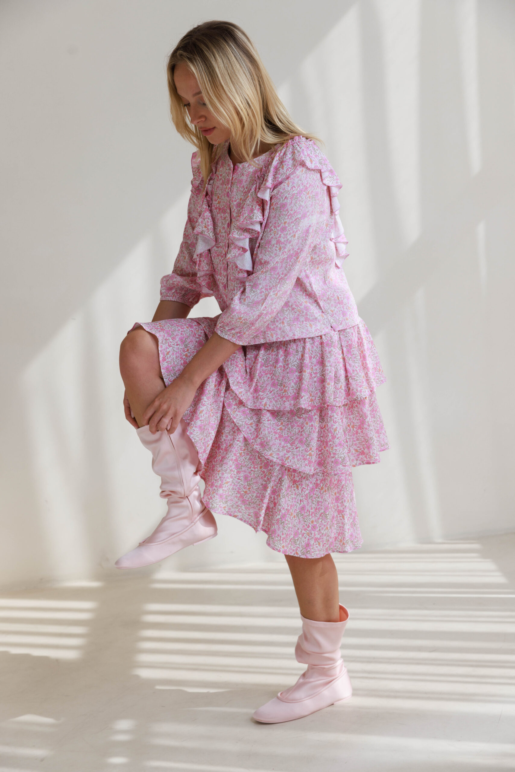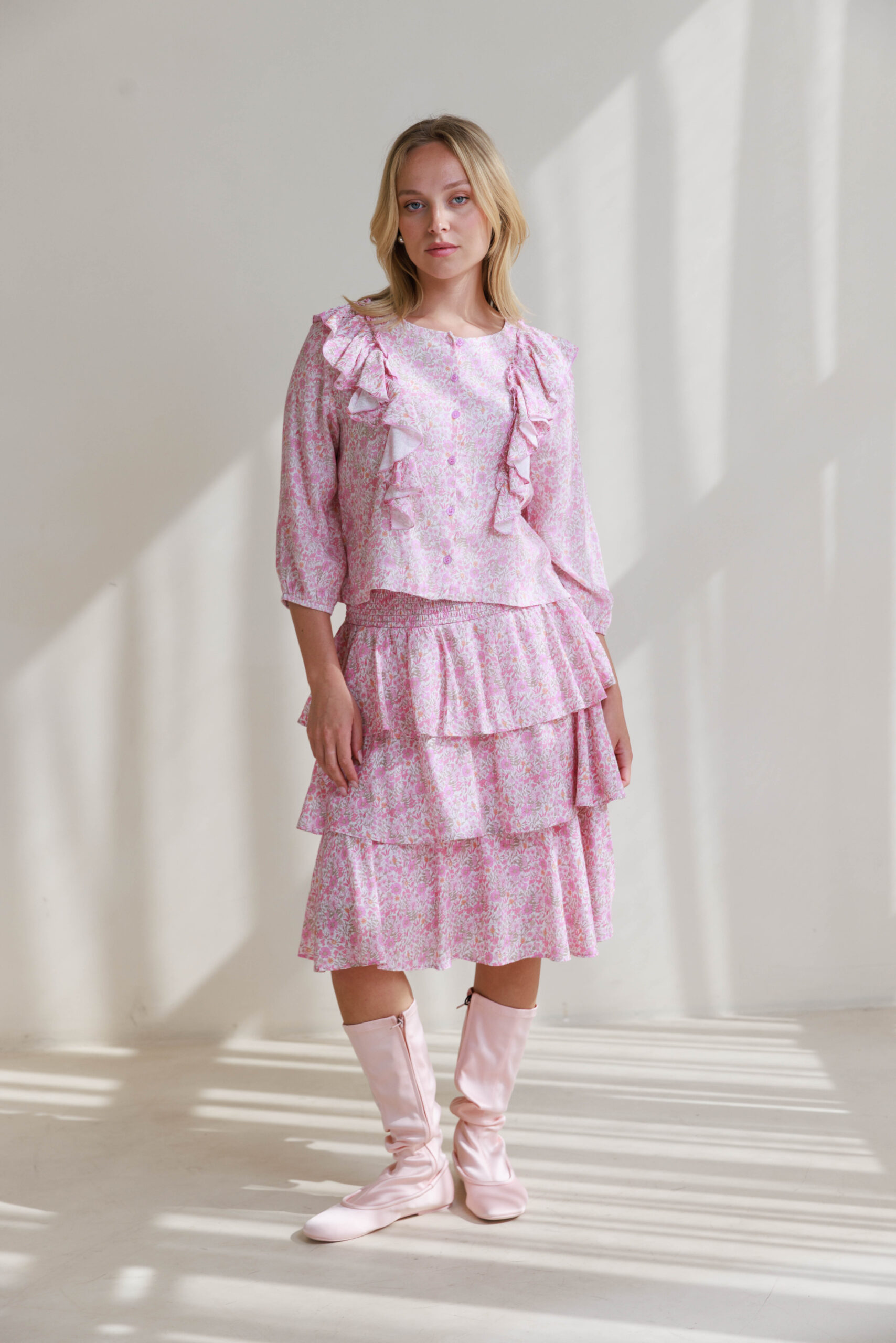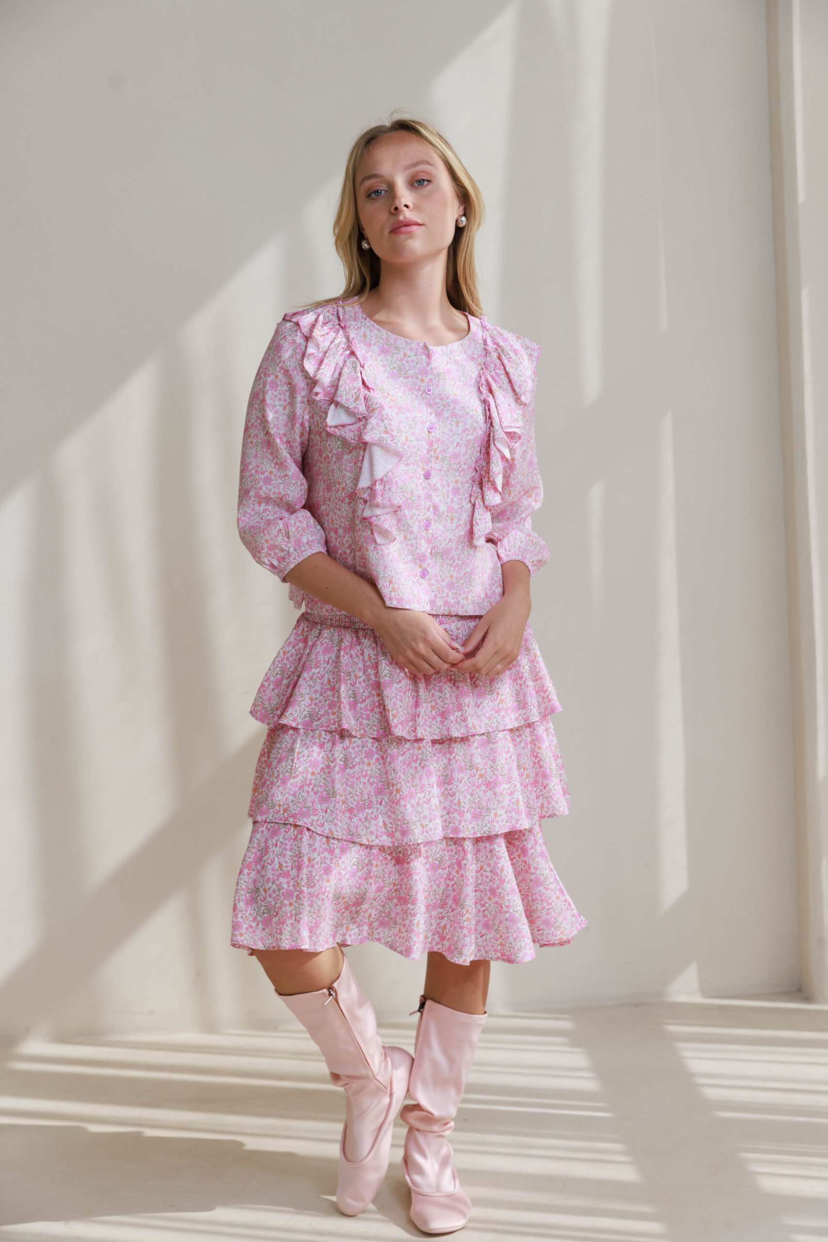 חצאית קצרה ורודה עם הדפס פרחוני עדין בגווני ורוד.