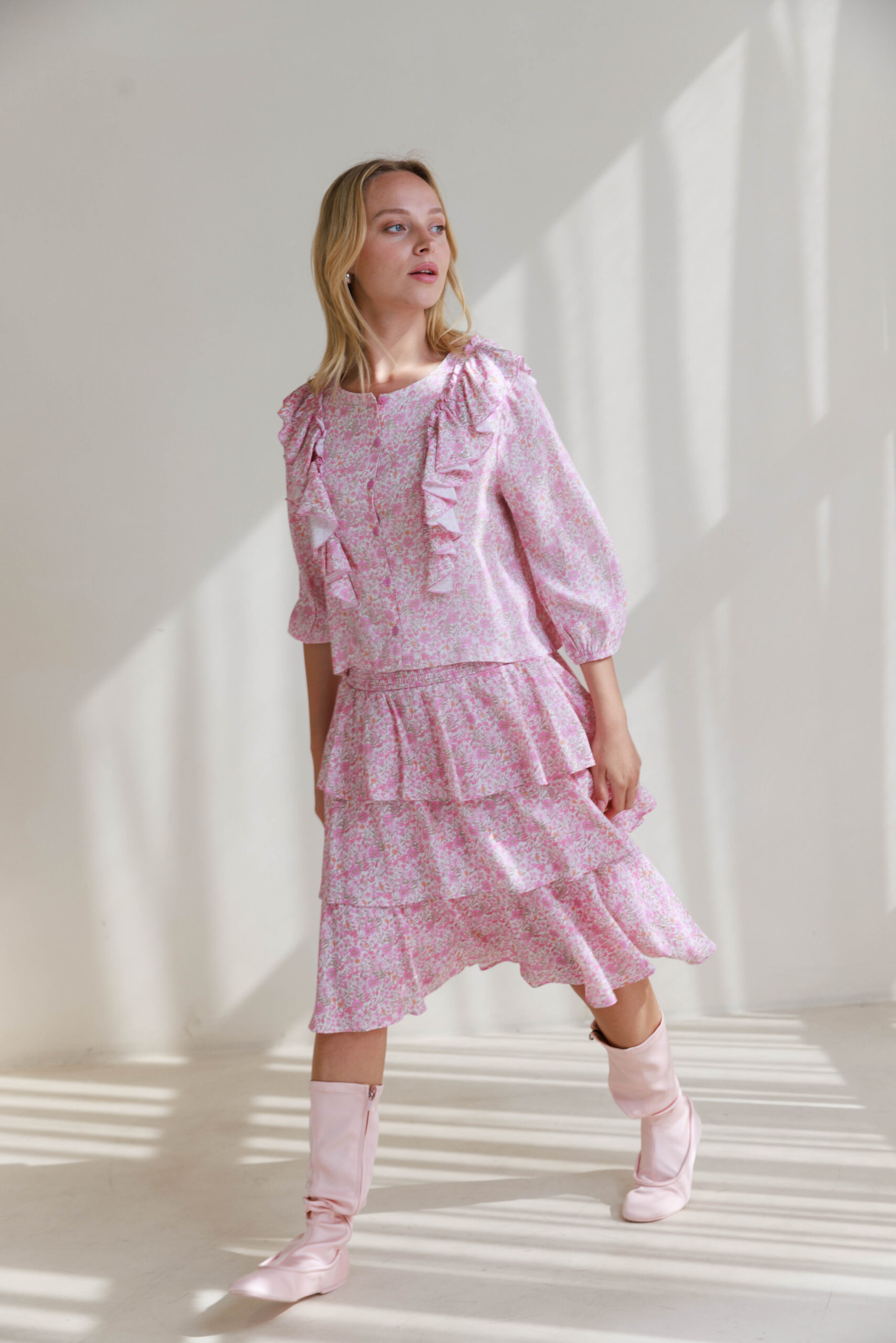 החצאית מעוצבת בכמה שכבות של בד בגזרת רפל (כיווצים), היוצרות מראה נשפך ונשי.