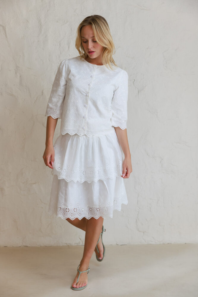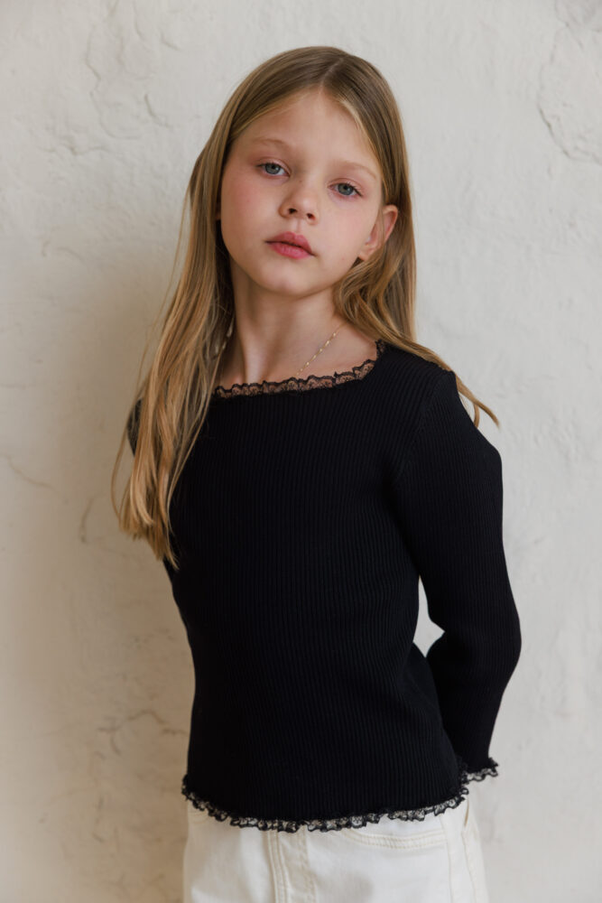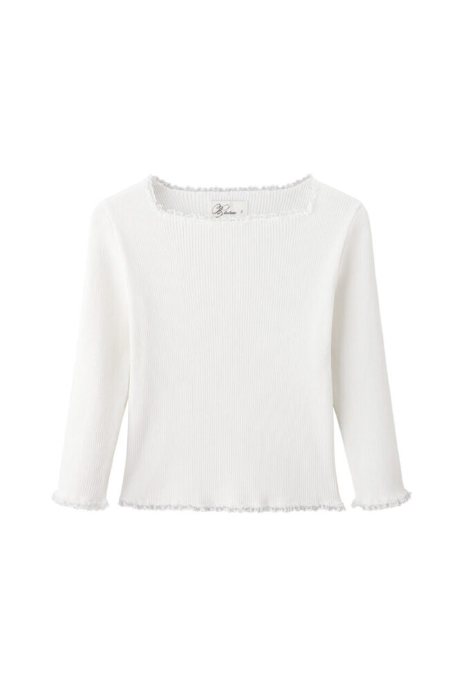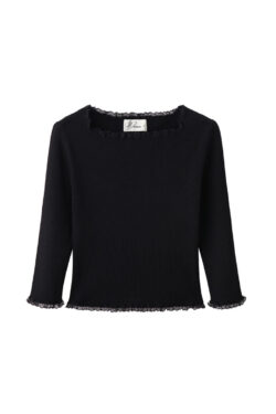 גזרה צמודה עם פתח צוואר מרובע מעוטר בתחרה עדינה.