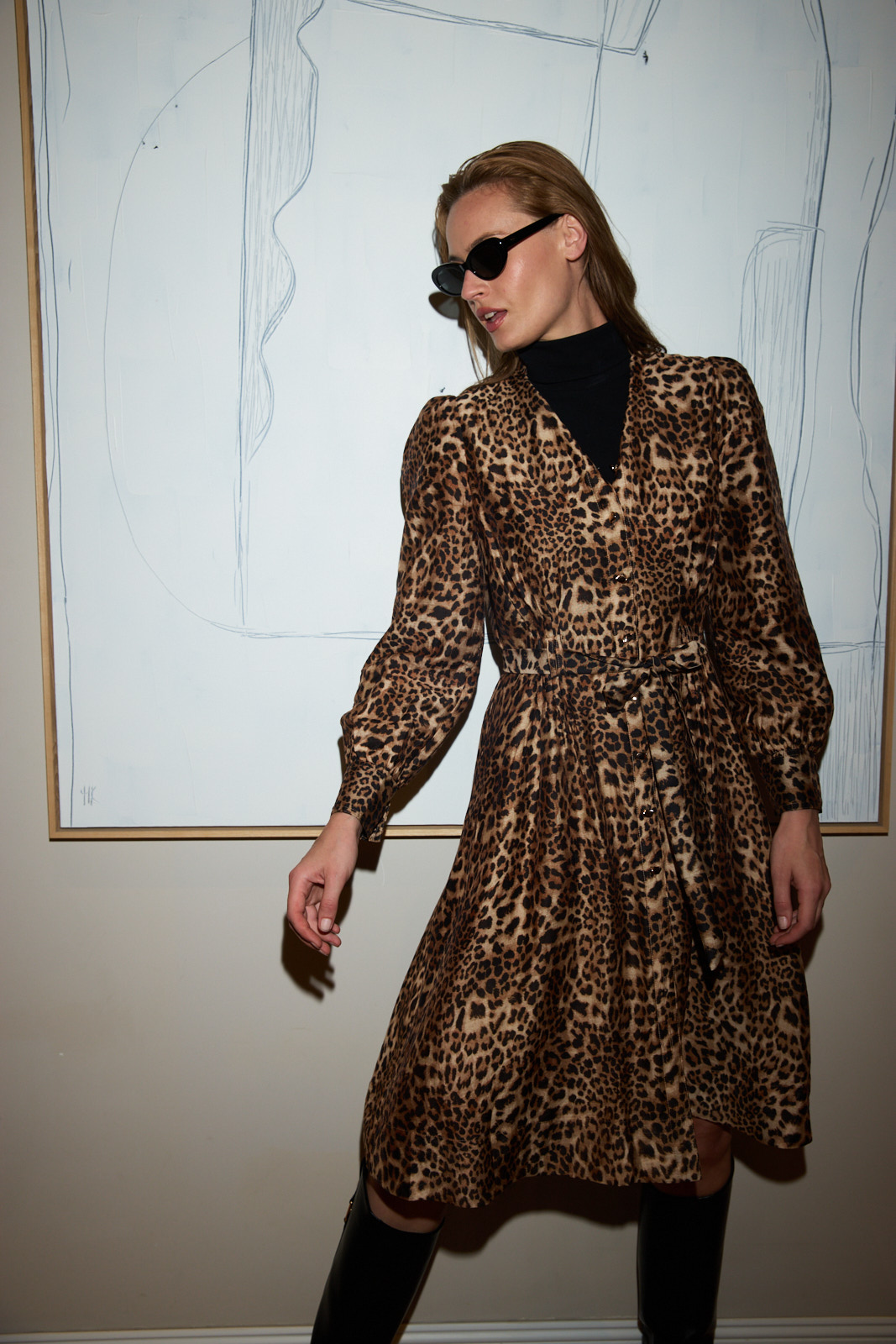 שמלה מכופתרת עם חגורה מנומר ארוך