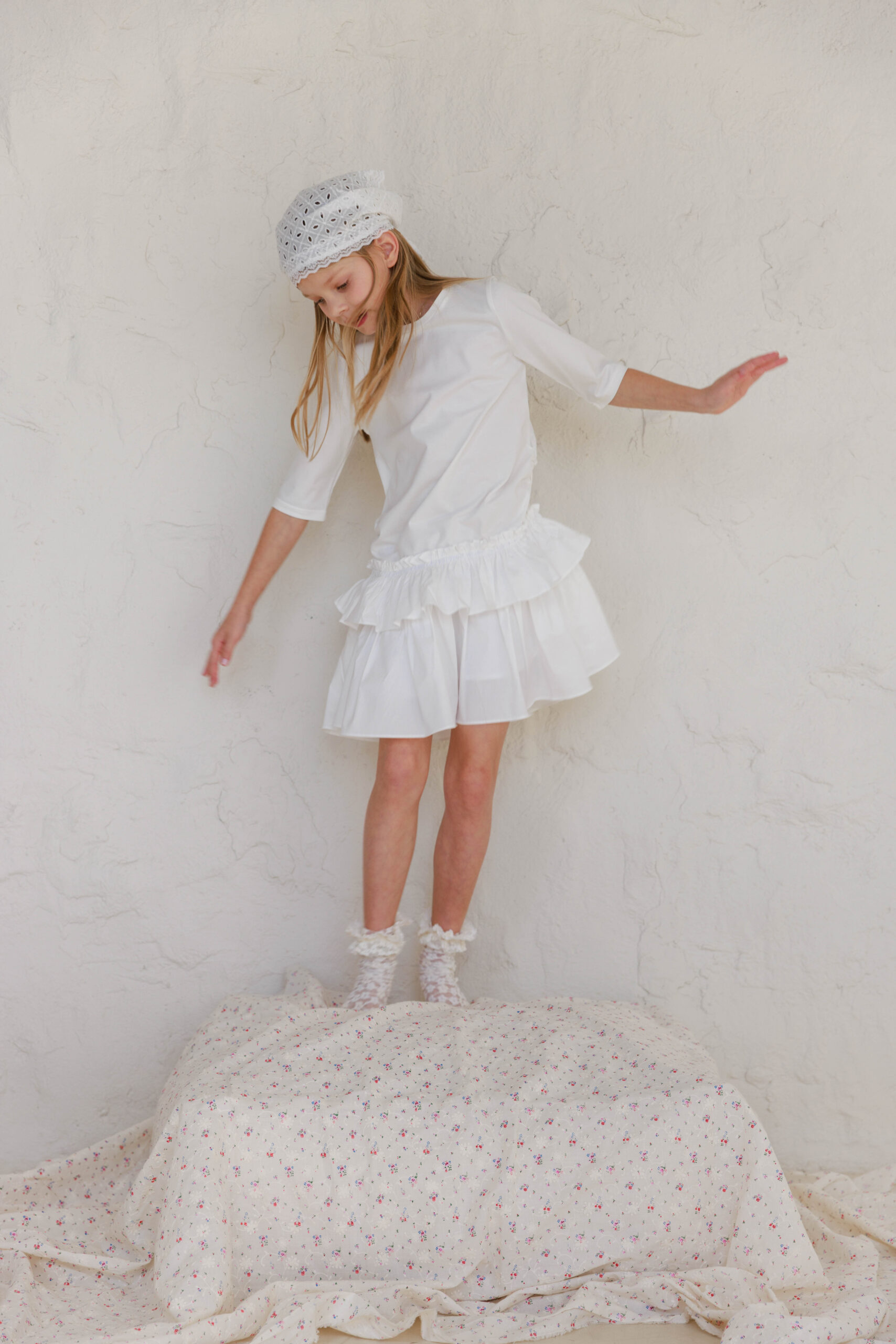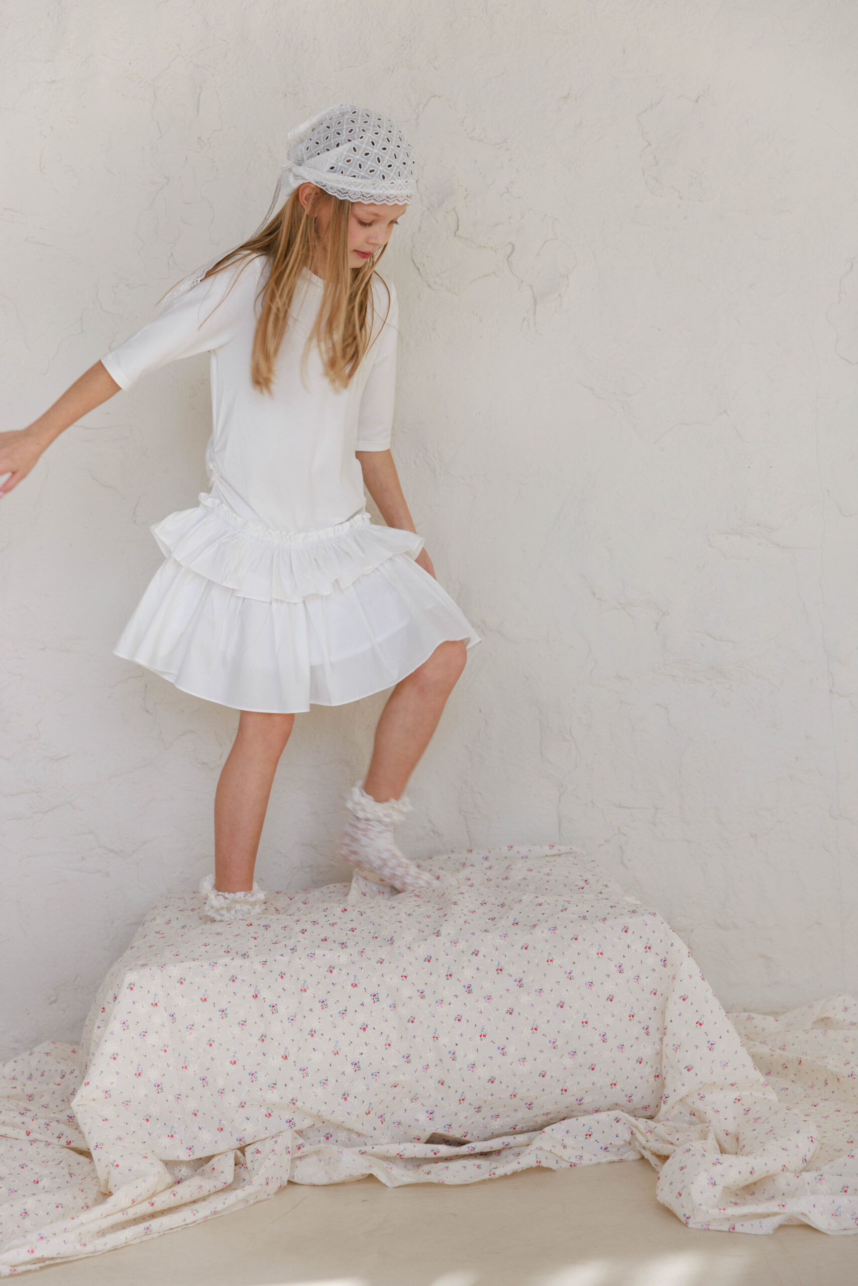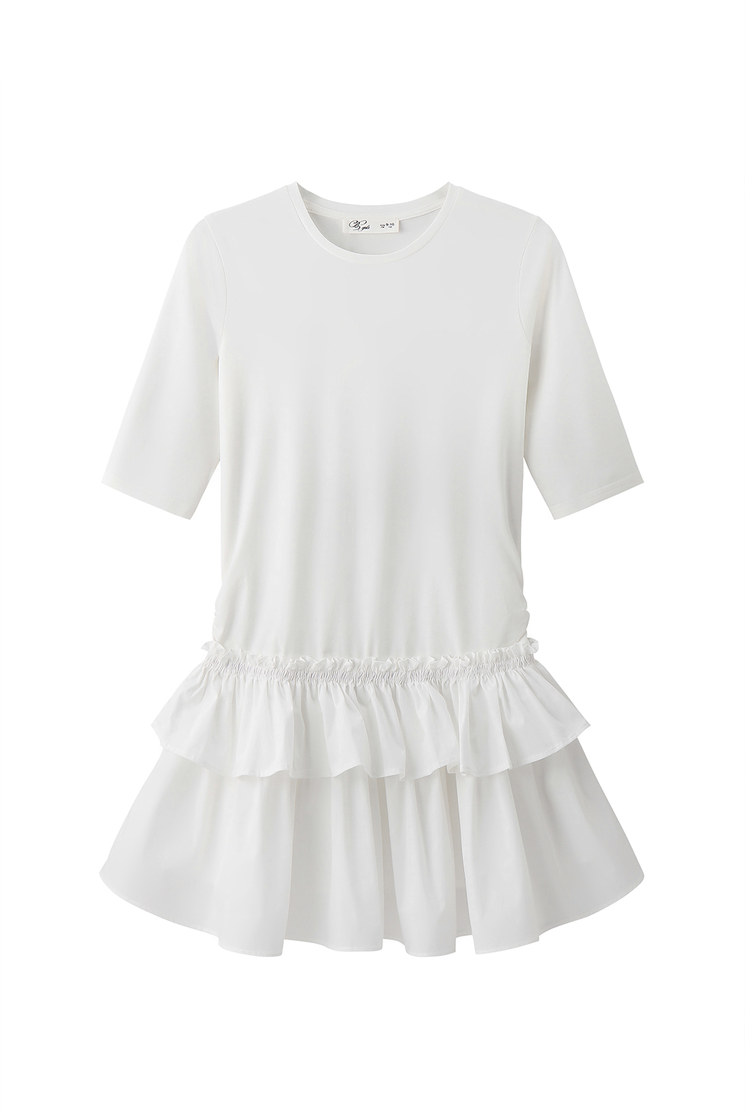בחלק התחתון חצאית בשתי קומות עם כיווץ, היוצרות מראה של חצאית קומות או טוטו.