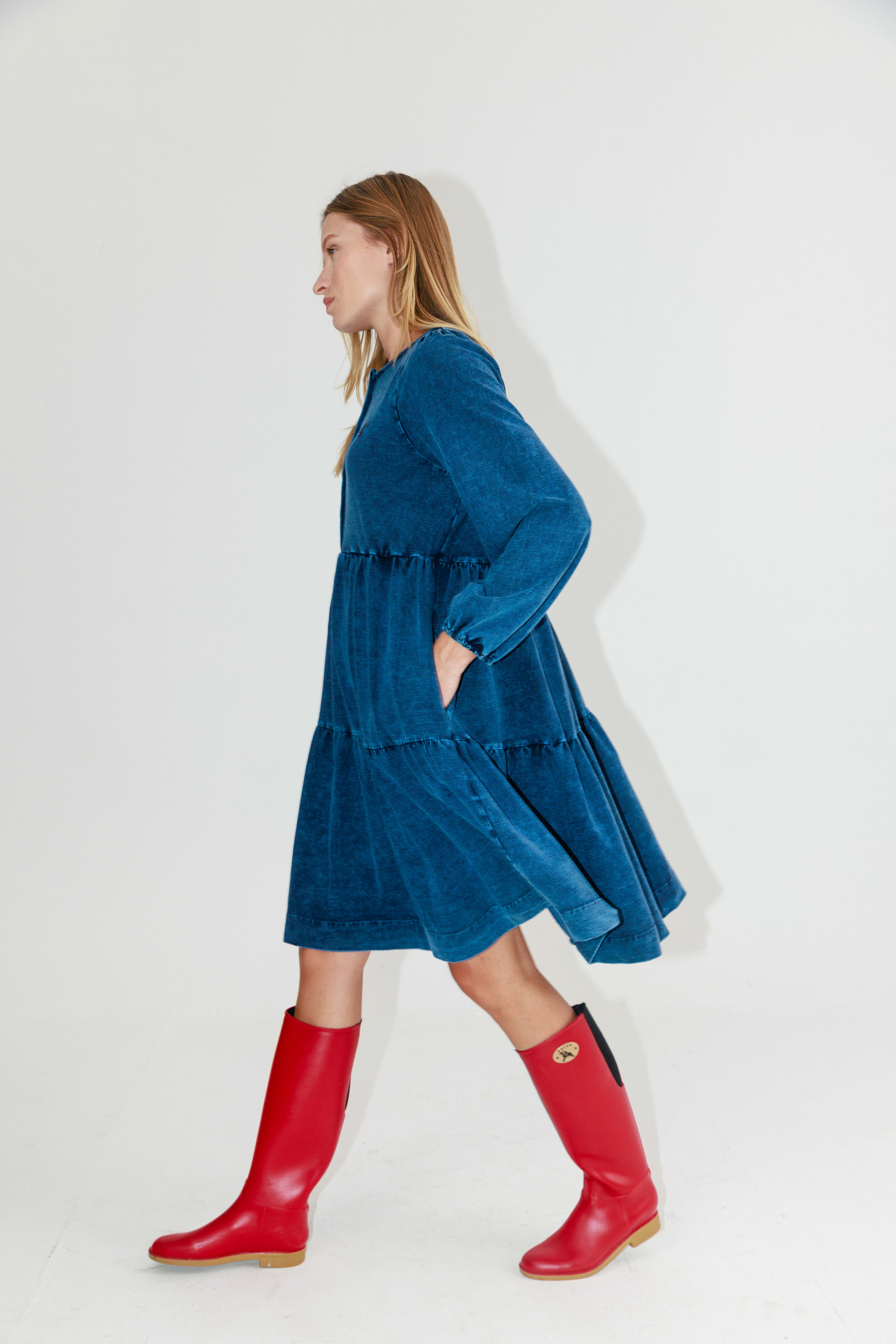 עשויה בד דנים קליל, בגזרה מתרחבת עם שכבות שמוסיפות תנועה ונוכחות.