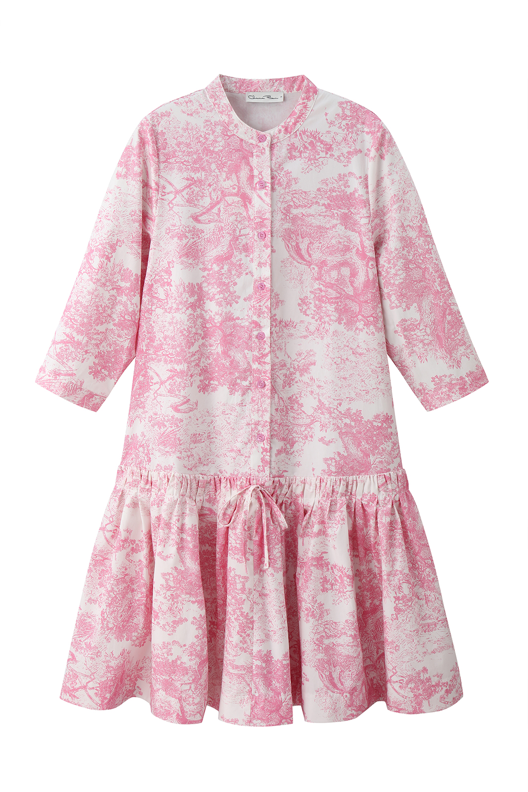 לשמלה שרוולים באורך 3/4, כפתורים נסתרים בחזית, וצווארון סיני .